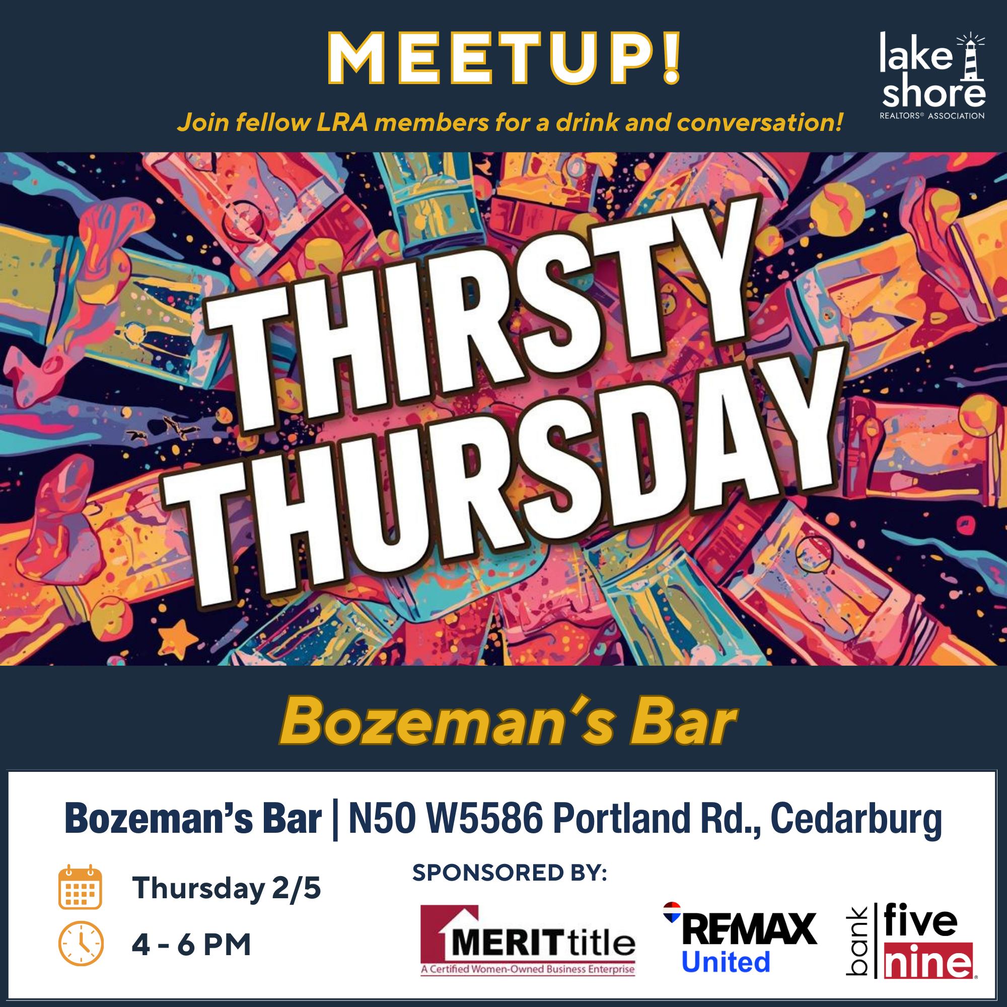 Meet up for our first Thirsty Thursday of 2026! 4-6pm at Bozeman's Bar in Cedarburg, sponsored by Merit Title, Re/Max and Bank Five Nine. Thanks Barb, Owen and Ellen! Enjoy a drink, some appetizers and great company. Hope to see you there!